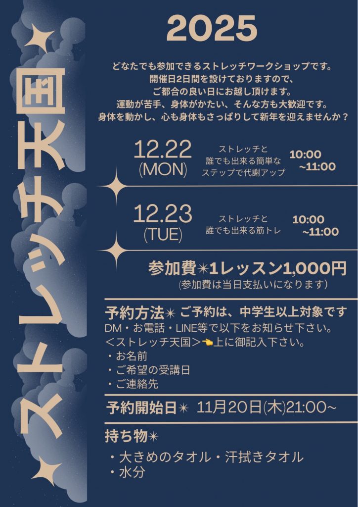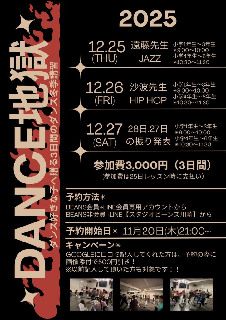 【ダンス地獄】 毎年恒例、ダンス地獄‼今年も開催致します。 ダンス好きな子へ贈る3日間のダンス冬期講習❄長い冬休みをダンス三昧で過ごせちゃう‼ 1日目☆沙波先生によるHIPHOP🔥 2日目☆遠藤先生によるJAZZ🎩 3日目☆1日目&2日目の発表💃 最高に濃い時間の3Days🧡 【ストレッチ天国】 こちらも毎年恒例!!遠藤先生によるストレッチワークショップ🌿 中学生以上から受講可能✨️今年は2日間の開催!! この機会にぜひ参加してみませんか?1日のみ受講も大歓迎✨️ Follow me! FacebookXHatenaPocketCopy